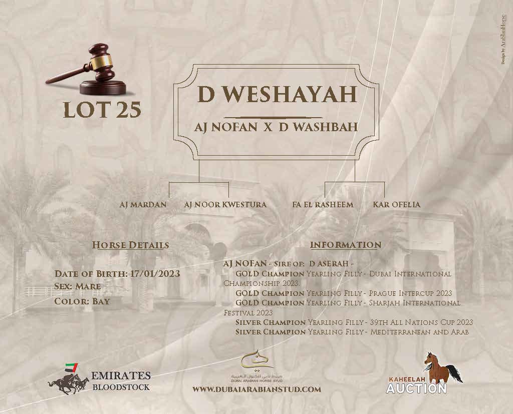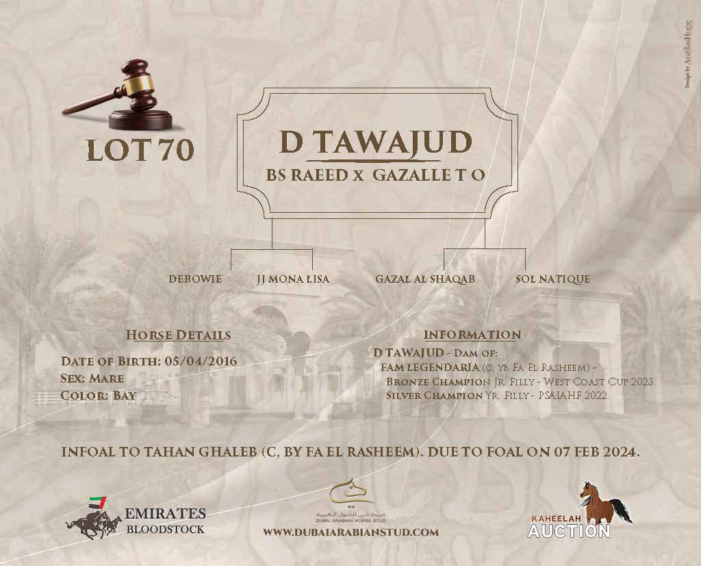Notes:INFOAL TO TAHAN GHALEB (C, BY FA EL RASHEEM). DUE TO FOAL ON 07 FEB 2024.